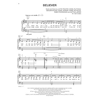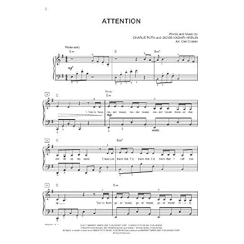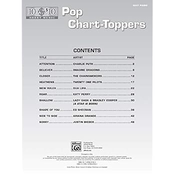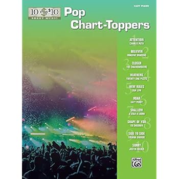 10 for 10 Sheet Music: Pop Chart-Toppers contains 10 of your favorite pop hits, all arranged at the Easy Piano level for just $10.00. Titles: Attention (Charlie Puth) * Believer (Imagine Dragons) * Closer (The Chainsmokers) * Heathens (Twenty One Pilots) * New Rules (Dua Lipa) * Roar (Katy Perry) * Shallow (A Star Is Born) * Shape of You (Ed Sheeran) * Side to Side (Ariana Grande) * Sorry (Justin Bieber).